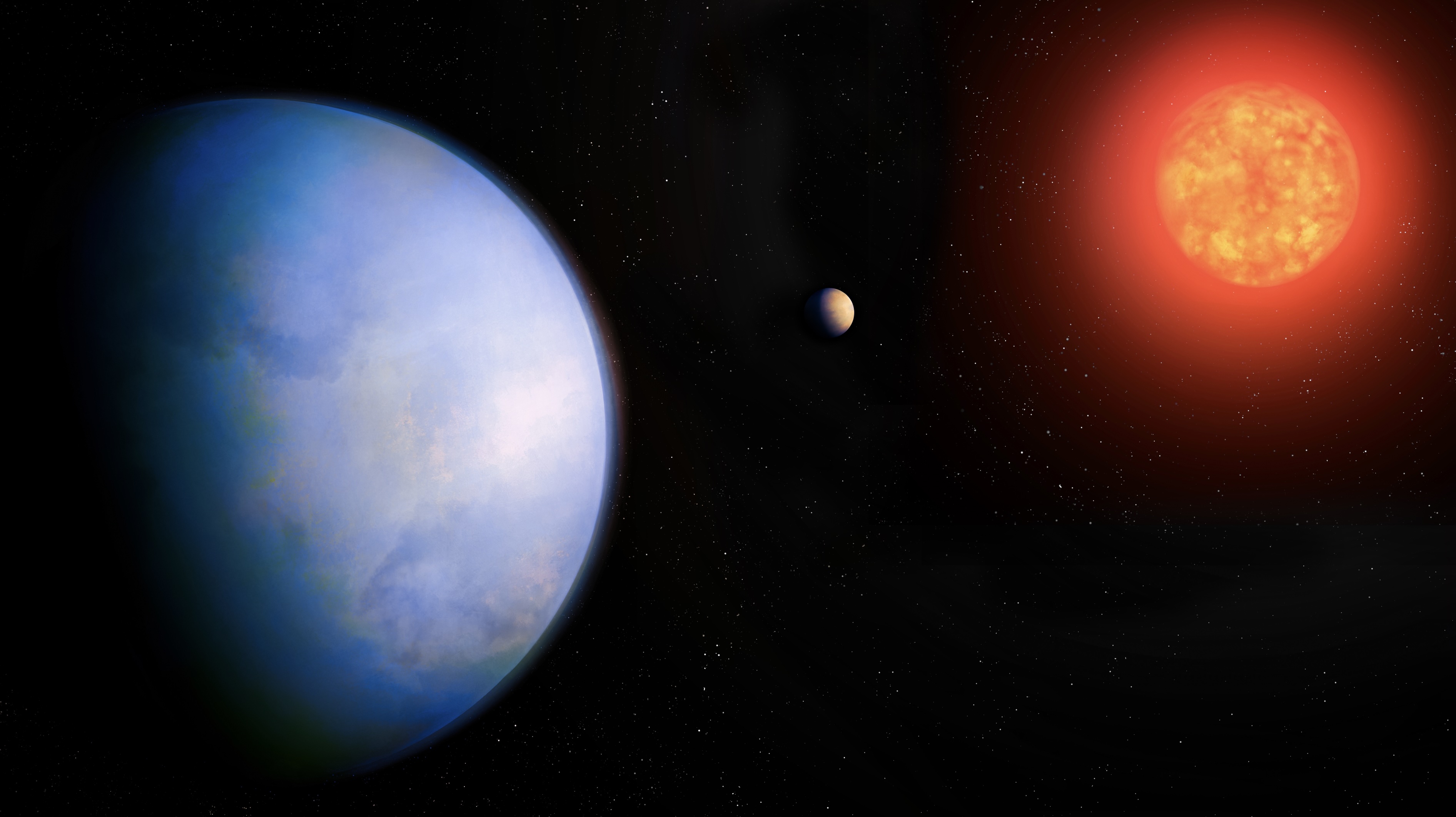 An artist’s conception of GJ 251 c, showing the planet (left), its host star (right), and a previously discovered planet that orbits closer to the star (middle).